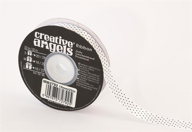 Szatén szalag, 15 mm x 22 m, fehér fekete pöttyökkel