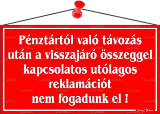Pénztártól való távozás után reklamációt nem fogadunk el! információs tábla