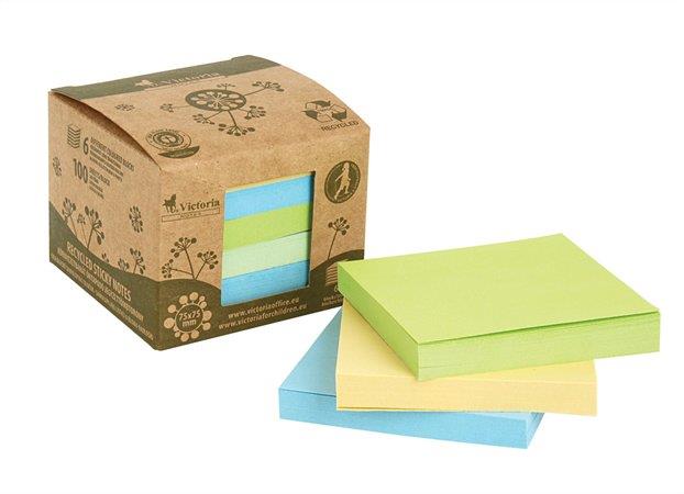Öntapadó jegyzettömbtorony, 75x75 mm, 6x100 lap, környezetbarát, VICTORIA OFFICE, "Green", vegyes