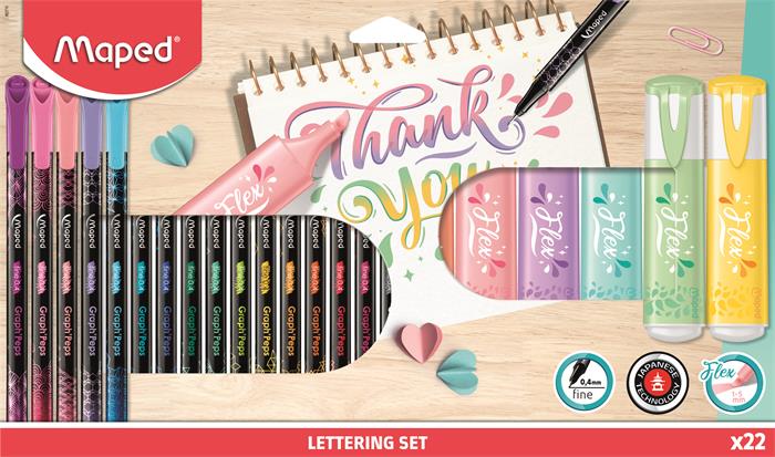 Kalligrafikus készlet, 22 darabos, MAPED "Lettering Set", 6 szövegkiemelő + 16 tűfilc különböző színekben