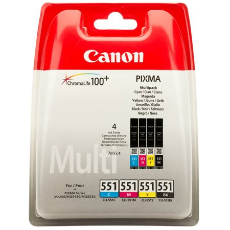KezdőlapTechnológiaNyomtató-kellékanyagokEredeti nyomtató-kellékanyagokCLI-551KIT Tintapatron multipack Pixma iP7250, MG5450 nyomtatókhoz, CANON, b+c+m+y, 4*7ml