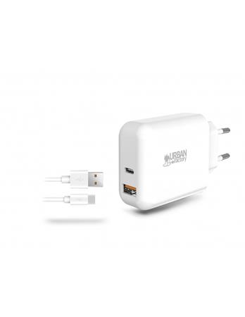 Hálózati töltő, 1xUSB-A (18W), 1xUSB-C (45W), USB-A–USB-C kábel, URBAN FACTORY